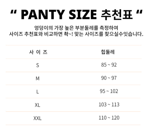 위 사이즈표에서 본인 힙둘레가 구간이 뒤쪽인 경우를 선택하는게 좋은것 같아요.